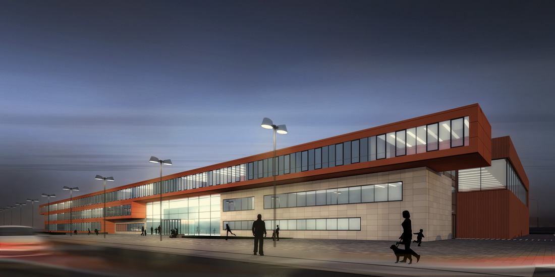 Pozicija škole na parceli valorizira glavnu prometnicu i prema njoj formira ulazni trg. Ostakljeno dvoetažno pročelje ulaznog halla uvučeno je pod trijem definiram učionicama na zadnjem katu. Hall je zamišljen kao centralna zona koja na sebe veže blagovanje i knjižnicu stvarajući prostran multifunkcionalni prostor.