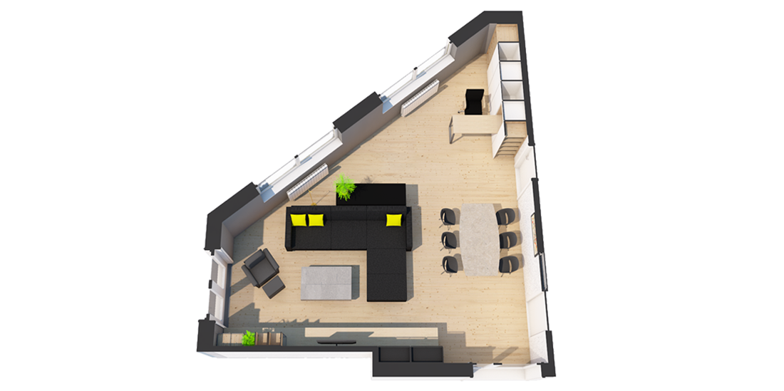 Želja investitora bila je zonirati i osmisliti nepravilan prostor boravka s blagovanjem u novijoj stambenoj zgradi.